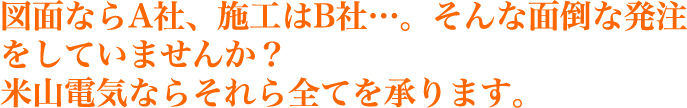 打ち合わせからアフターフォローまで米山電気では、一貫したサービスを提供させていただいております。 図面ならA社、設置ならB社といった具合に多種に渡る発注はストレスがたまるものです。 米山電気では初回打ち合わせから行いますので、情報伝達の漏れやスケジュールの調整などの 心配もありません。